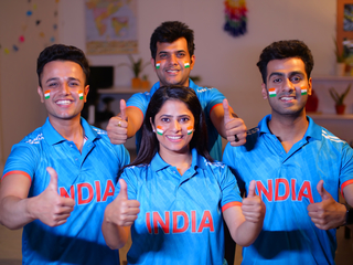 Young Indian cricket fans holding hands and celebrating their cricket team's victory - Indian cricket team, cricket buffs