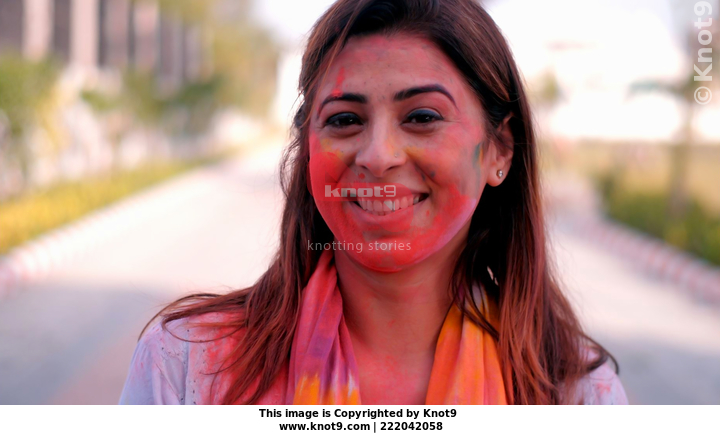 A beautiful Indian lady with her face covered in Holi colors smiling happily for the camera - a toothy smile, a Hindu festival