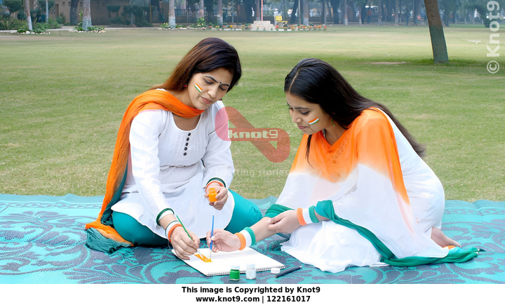 Pretty females dressed in white Kurtis and Tricolor Dupattas sitting outdoors - Republic Day, patriotism, National holiday