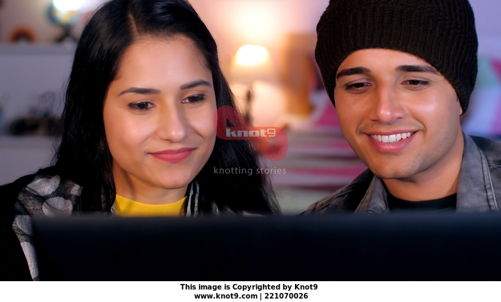 A happy Indian couple watch an online video together while relaxing on a sofa