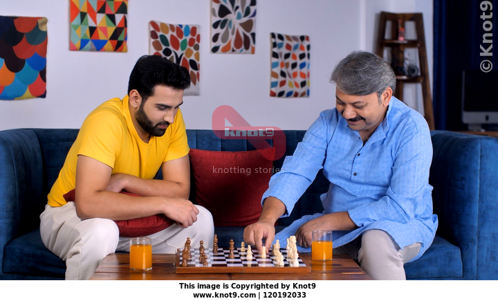 Description:An attractive male in his thirties concentrating while playing a board game with his father - strategy planning, foresight skills, competition, entertainment
