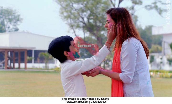 Description:An affectionate mother embracing her sweet son lovingly while celebrating the Indian festival of colors together - family bonding, leisure time, public park