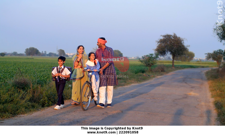 A small nuclear family in an Indian village - Village couple dropping their kids to school on a bicycle