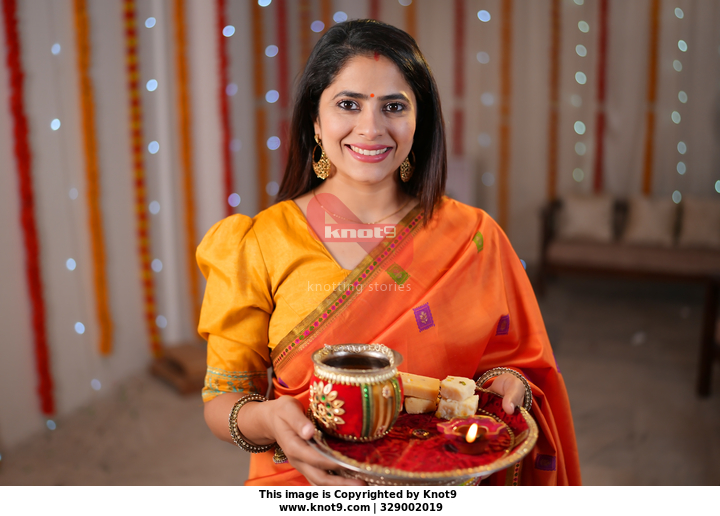 Beautiful Indian woman smiling at the camera on the occasion of Karwa Chauth - Indian rituals, posing for camera