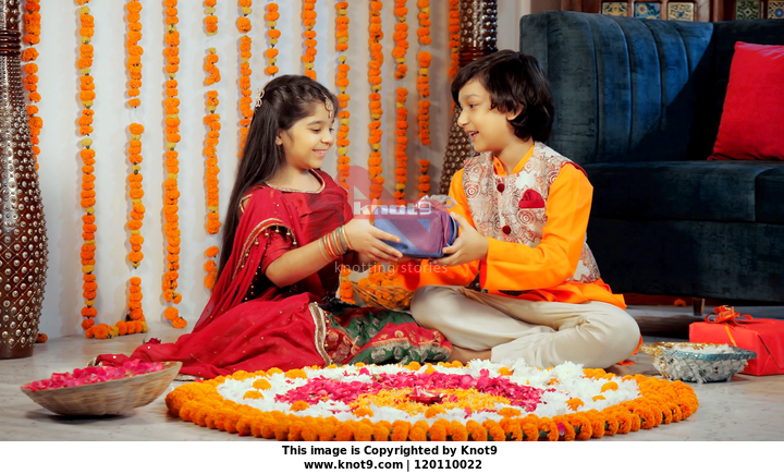 Happy brother and sister in ethnic attire exchanging gifts during a Hindu festival