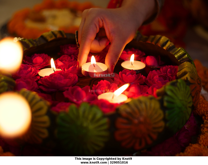 Women place floating candles or diyas in a bowl for the Diwali festival - auspicious day, decoration, Deepawali