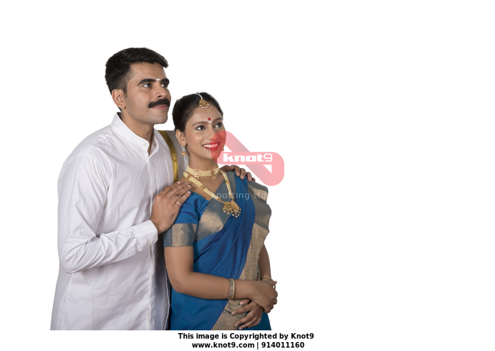 Portrait of a healthy south Indian couple going to temple to pray on Onam festival - Looking sideways on white background